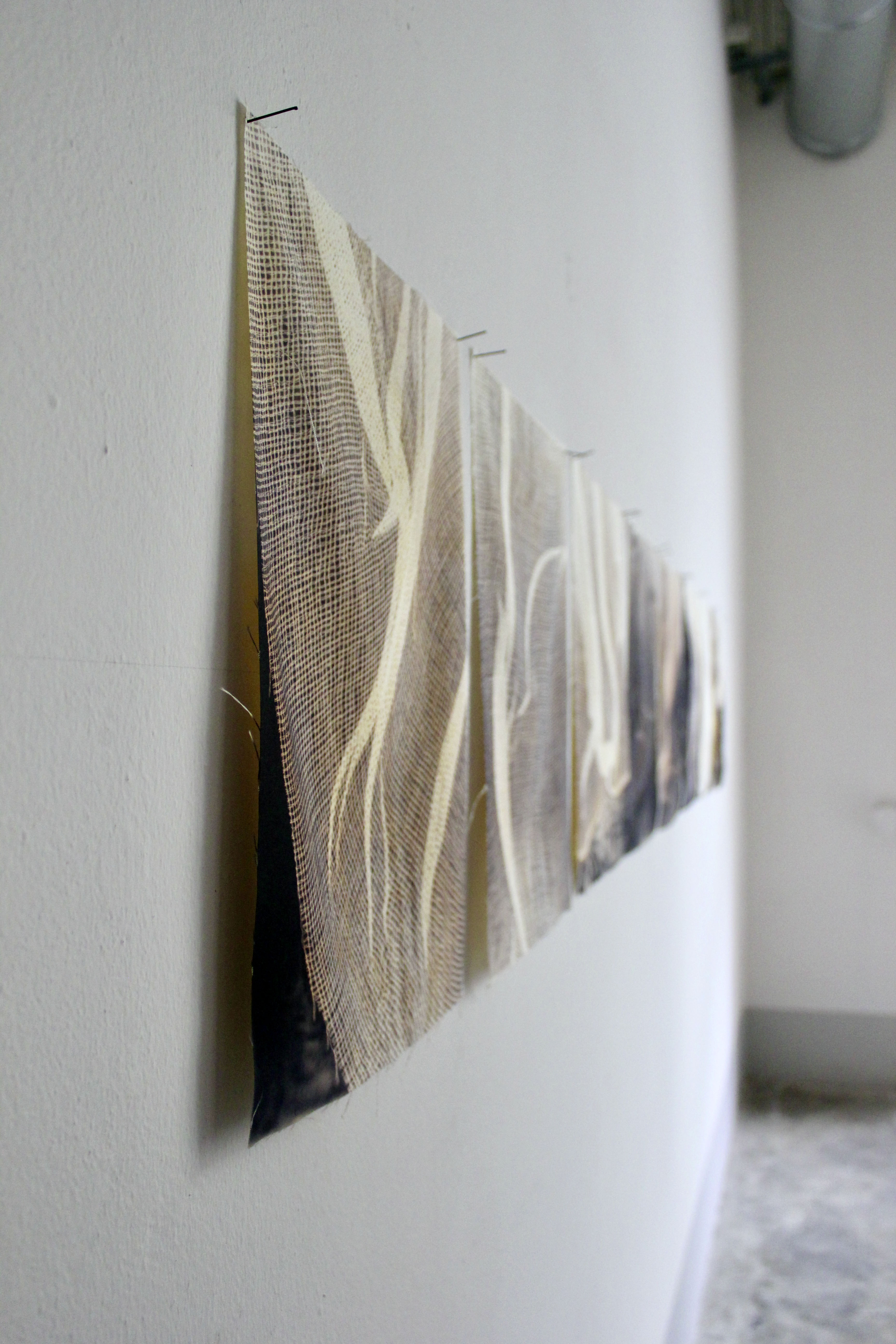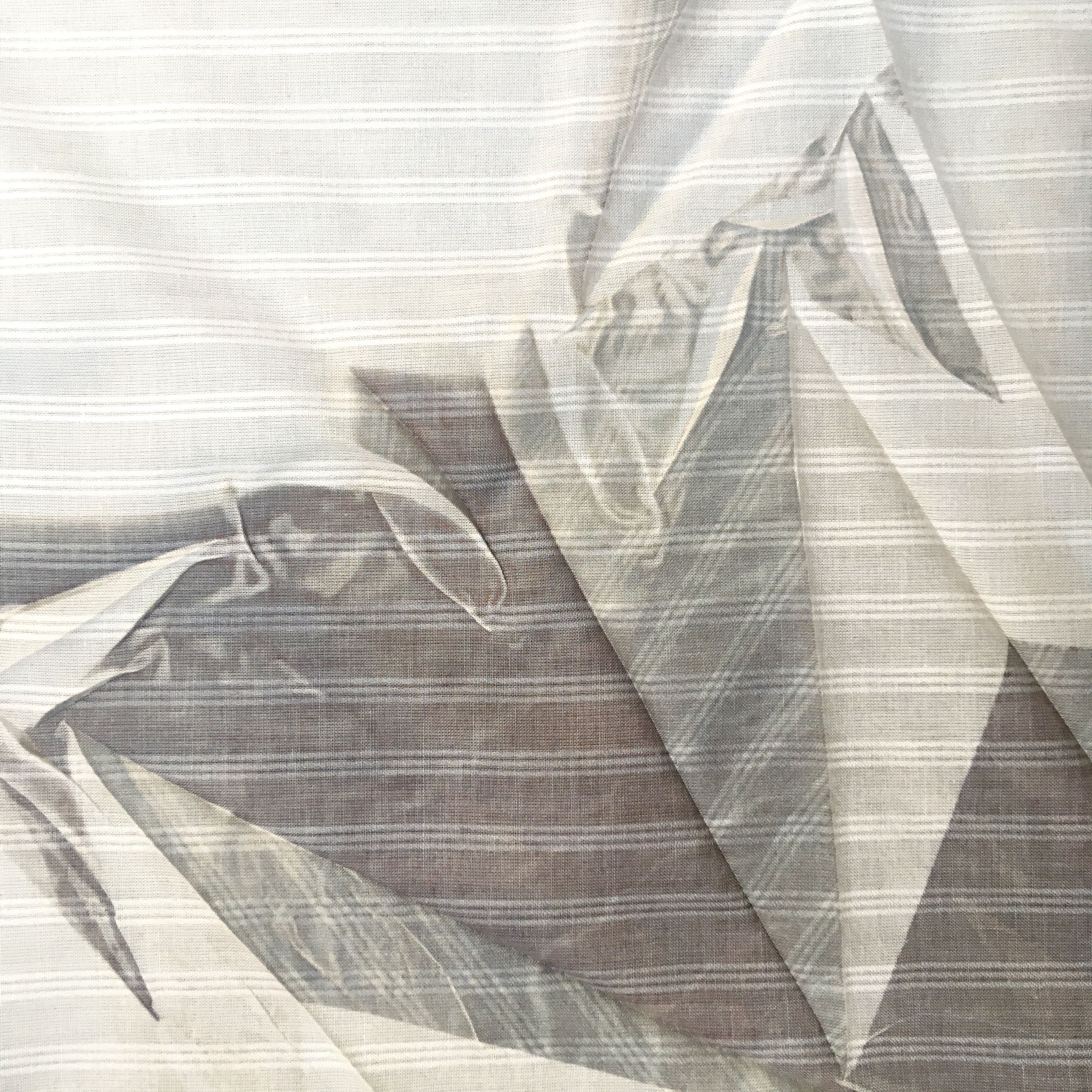 “Through the combination of different textile techniques (such as heat pressing, printing and weaving), the artist has produced a series of works in which the initial reflection on the concept of drapery, which also draws inspiration from the representation of the Renaissance painting, is translated into the realm of the visual, taking on the appearance of the early photographic image.”